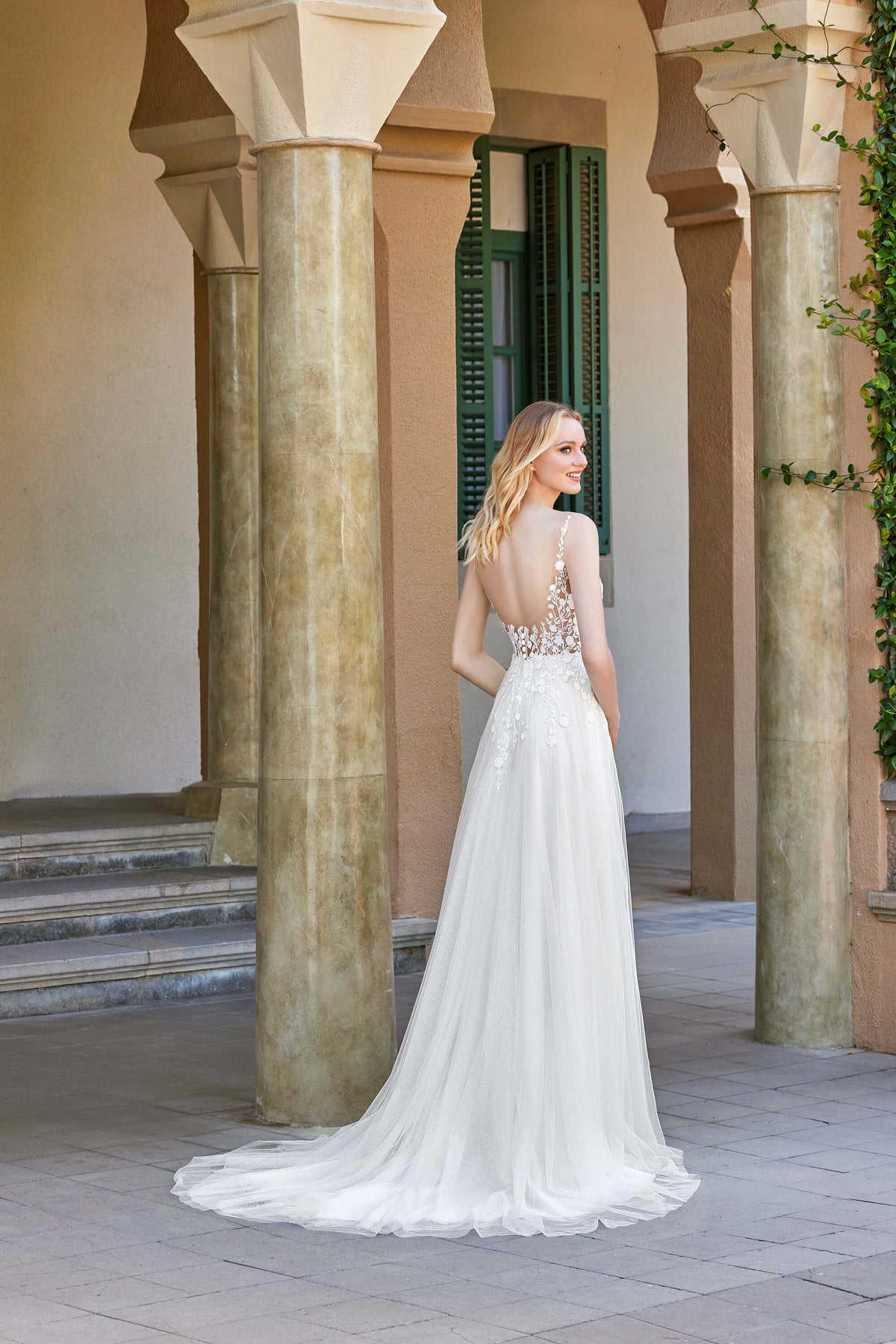 Den dybe V-ryg skaber en sofistikeret og elegant kontrast til den let gennemsigtige bodice, der er foret med tyl for diskret dækning. Blondeapplikationer med perler og pailletter flyder smukt ned over skørtet og tilfører en eksklusiv glød, der fanger lyset ved hver bevægelse.