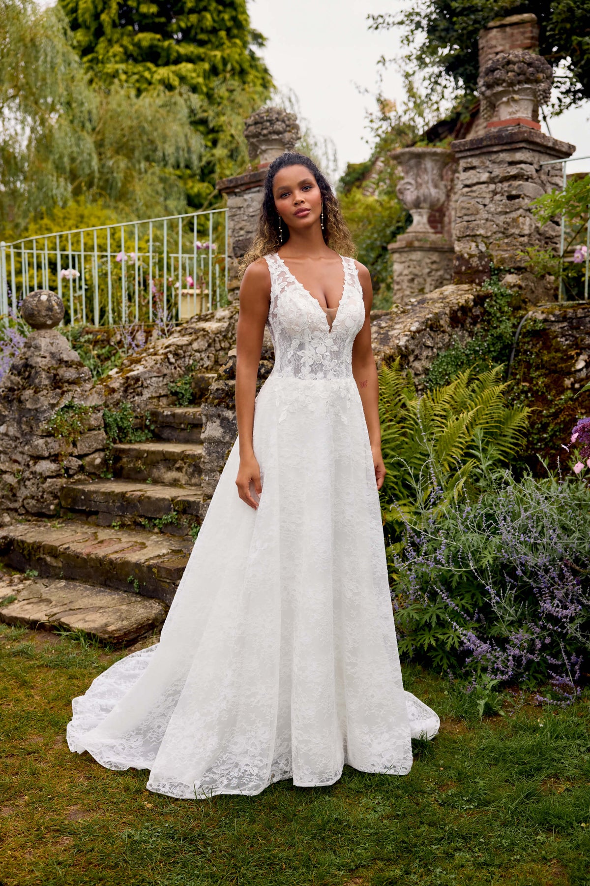 Den dybe V-udskæring med gennemsigtig midterdetalje fremhæver hals og overkrop på elegant vis, mens den transparente korsetlignende overdel er udsmykket med perle- og pailletbroderede blondeapplikationer over Chantilly-blonde.