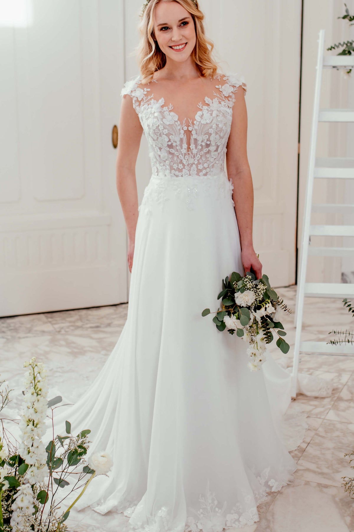 Sanna Lindstrøm SL1019X – Gina A-line brudekjole med 3D-blonder og chiffon-skørt
