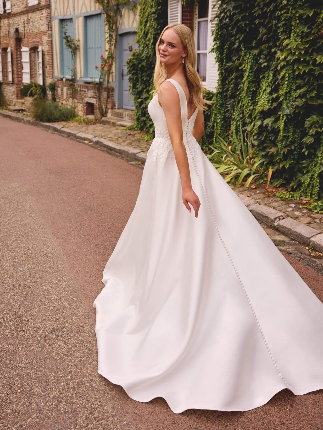 Sweetheart 20052 brudekjole set bagfra – elegant mikado A-line brudekjole med V-ryg og sweep-train.