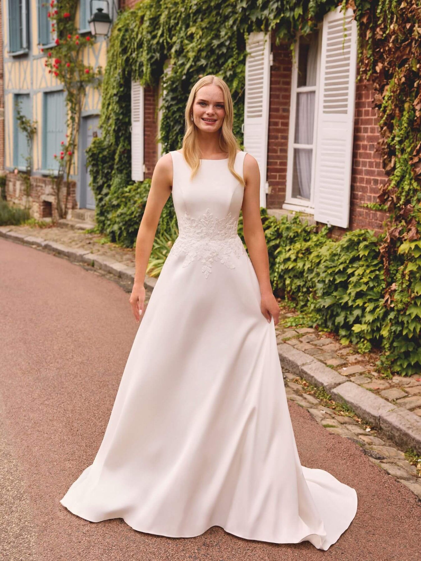 En A-line brudekjole for bruden, der ønsker et tidløst og eksklusivt design, hvor enkelhed møder romantik.
