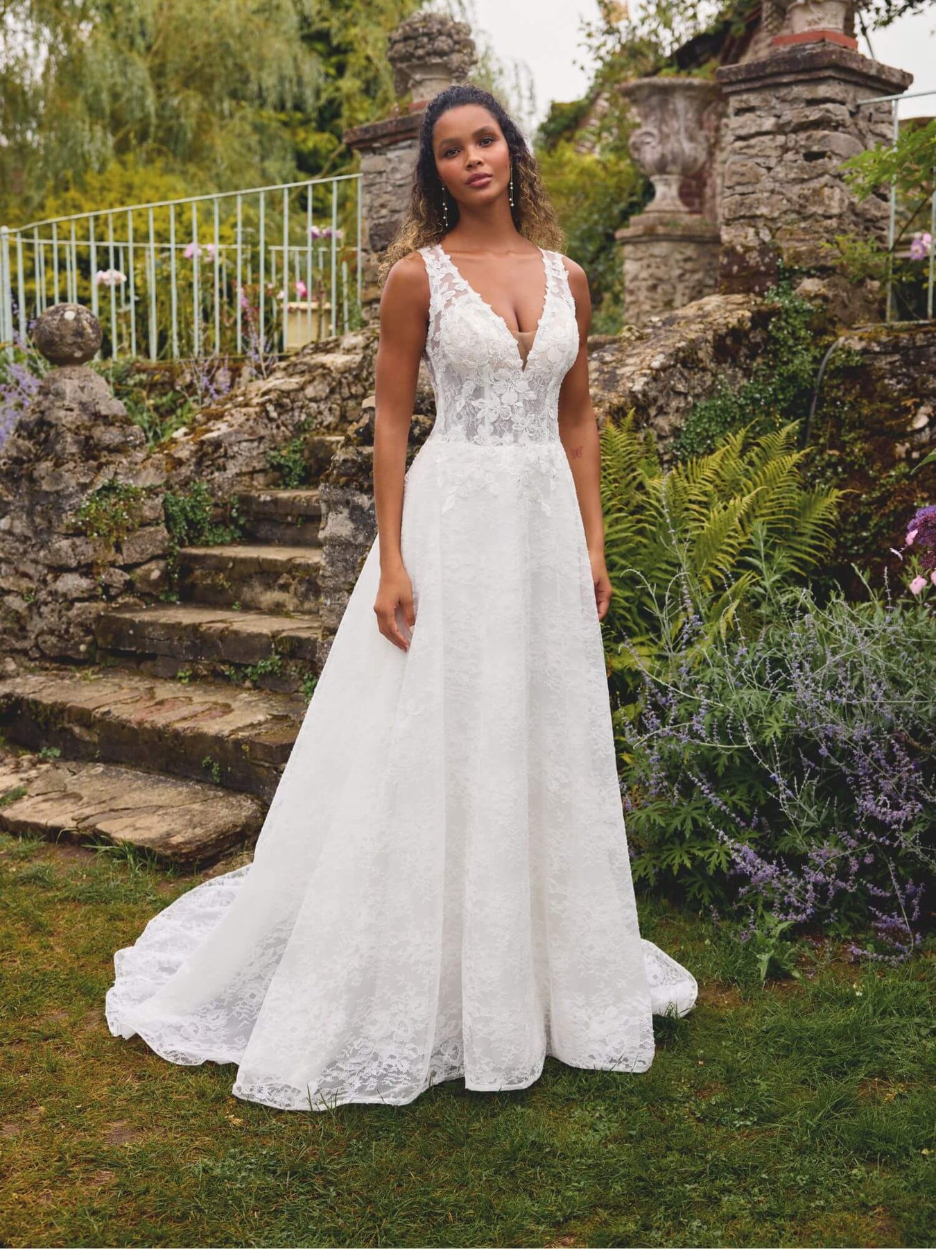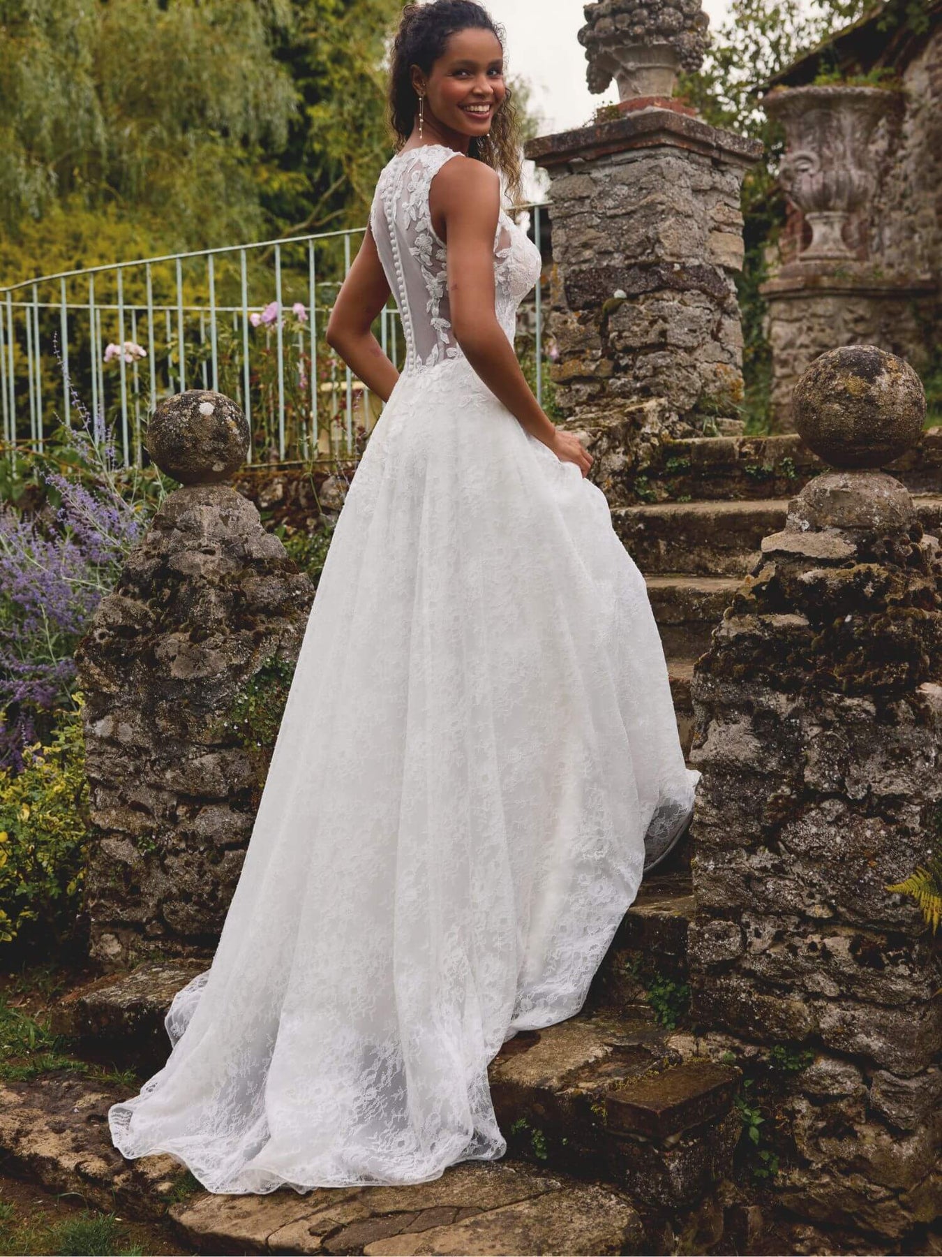 Denne betagende A-line brudekjole er skabt i eksklusiv blonde med et moderne og romantisk udtryk.