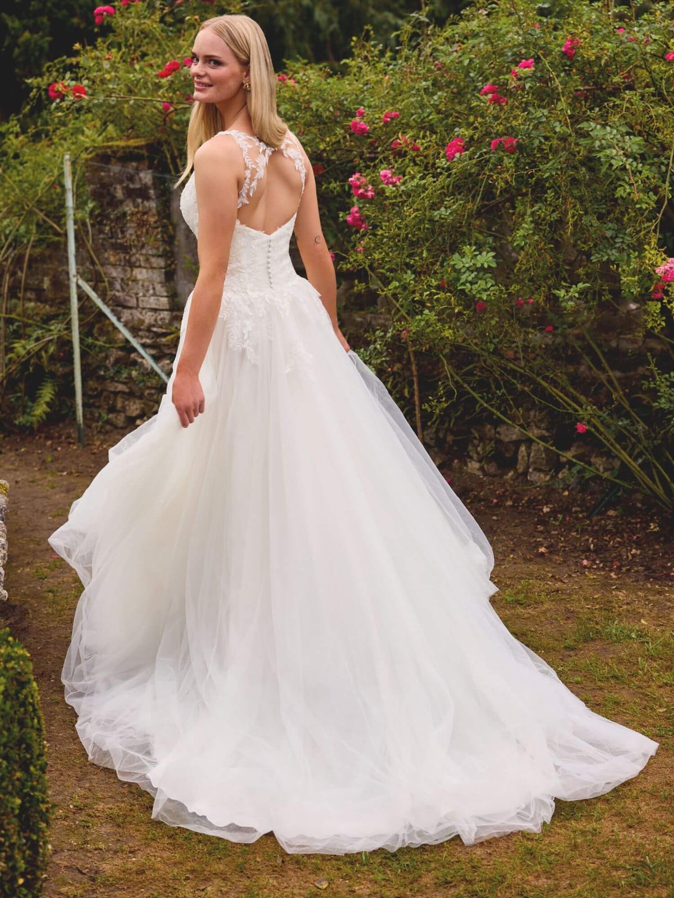 Den luftige tylskørt falder smukt og afsluttes med et slæb i chapel-længde, som giver kjolen et drømmende og tidløst look.
