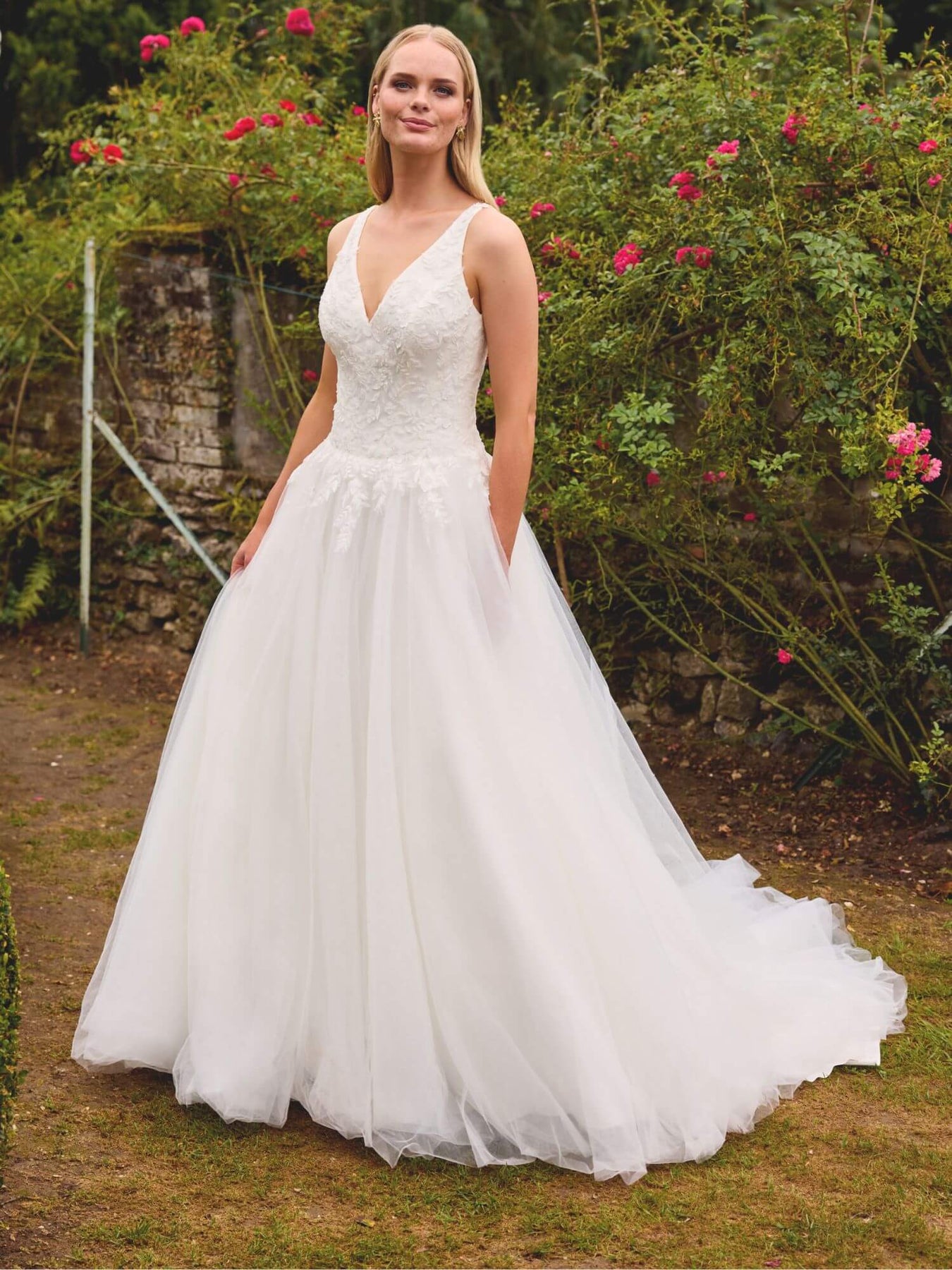 Denne romantiske A-line brudekjole i blød tyl forener klassisk elegance med moderne detaljer.