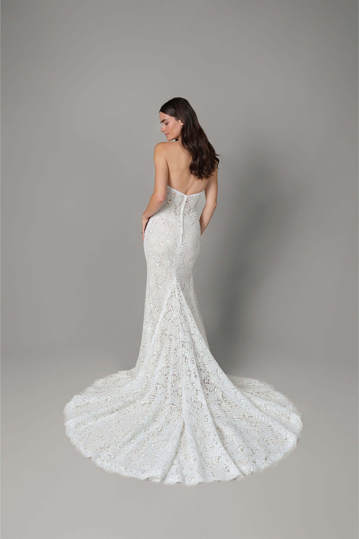 Den tætsiddende pasform smyger sig om kroppen, før skørtet falder let og elegant, hvilket giver et flatterende og harmonisk look. Perfekt til bruden, der ønsker en brudekjole med blonder, en Fit & Flare silhuet, eller en sofistikeret og sensuel kjole, der understreger hendes naturlige skønhed.