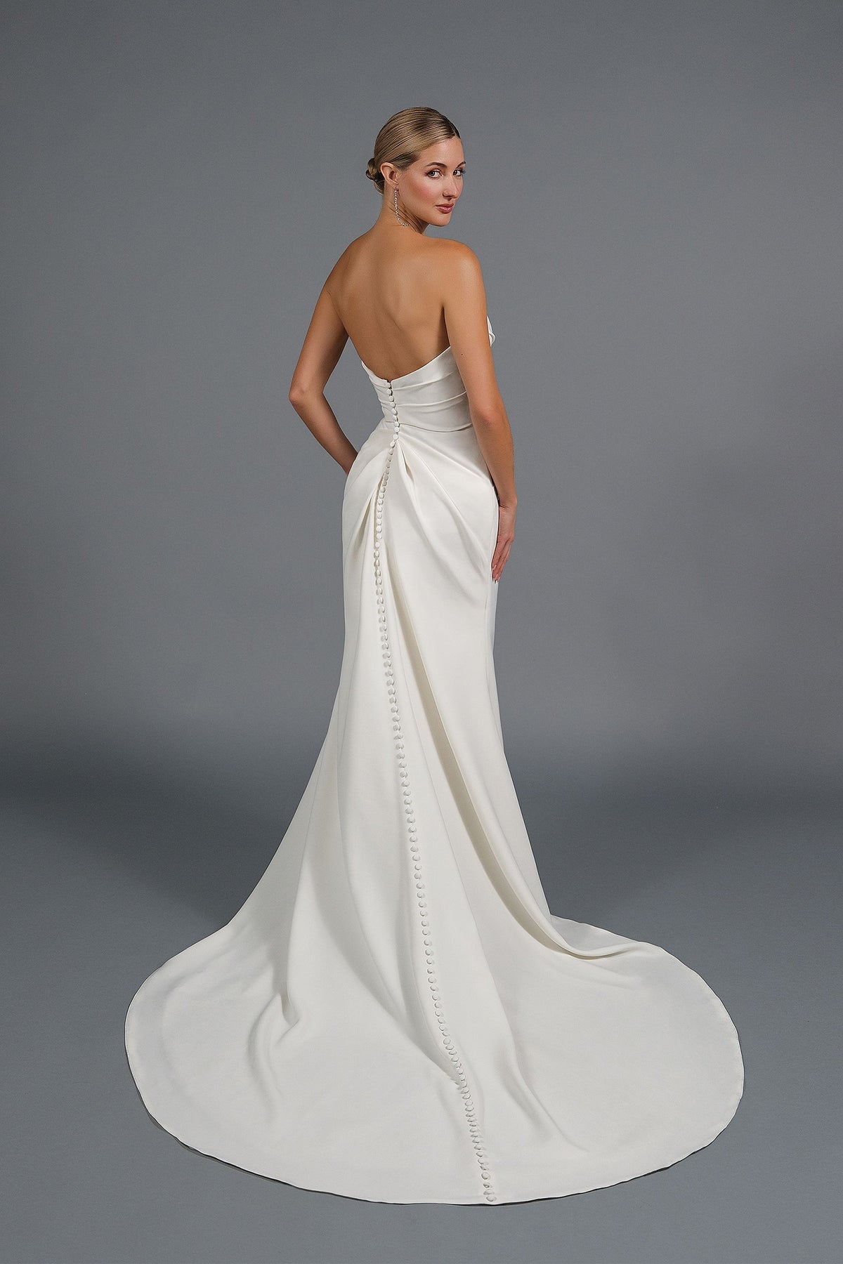 Bagsiden er udsmykket med en række klassiske stofknapper, der løber ned langs ryggen og fortsætter i det elegante slæb. Denne detalje tilfører kjolen et eksklusivt og romantisk udtryk, som gør den perfekt til både traditionelle og moderne bryllupper.