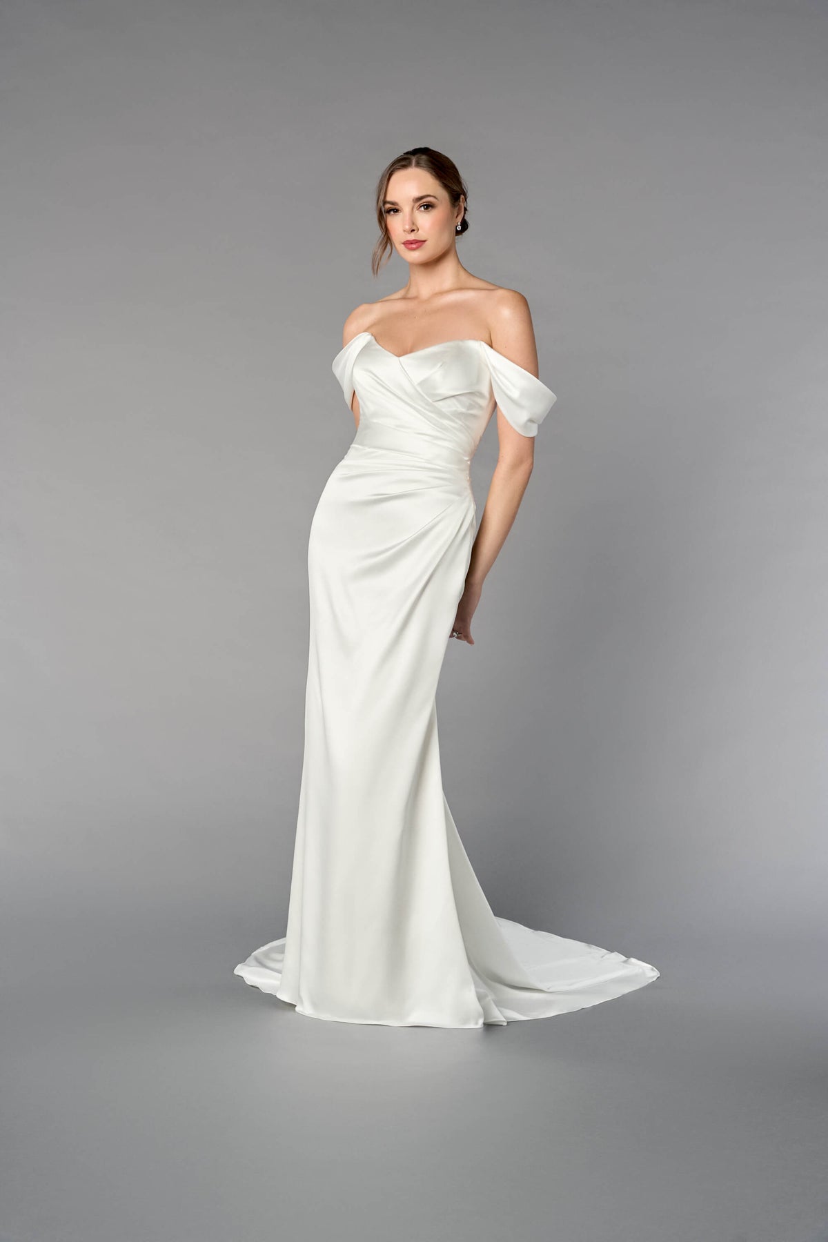 Delphine - satin brudekjole med off-shoulder og figursyet silhuet