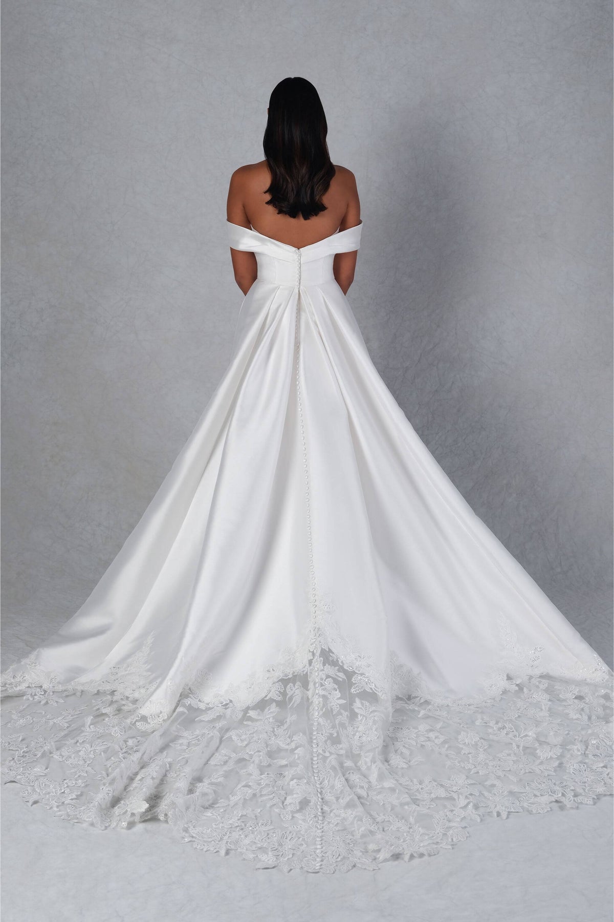 Denne storslåede A-line brudekjole i luksuriøst Mikado-stof kombinerer elegance og drama. Den off-the-shoulder detalje fremhæver skuldrene på smukkeste vis, mens den katedrallange slæb tilfører en majestætisk effekt, der får bruden til at føle sig som en prinsesse.