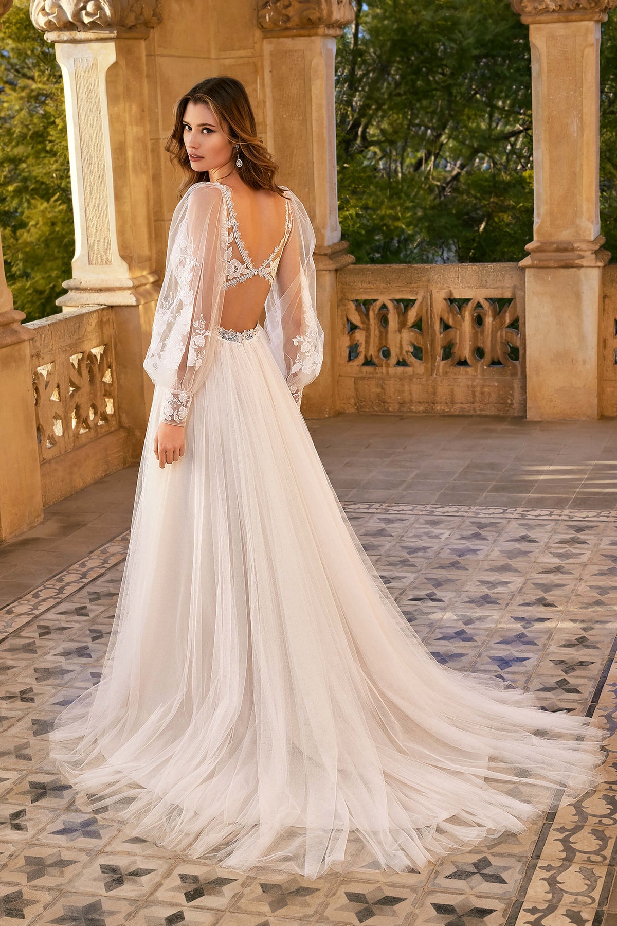 Den lave keyhole-ryg giver kjolen et moderne twist og fremhæver brudens silhuet på smukkeste vis. Det flydende skørt falder let og skaber en svævende effekt, der giver kjolen et drømmende og romantisk udtryk.