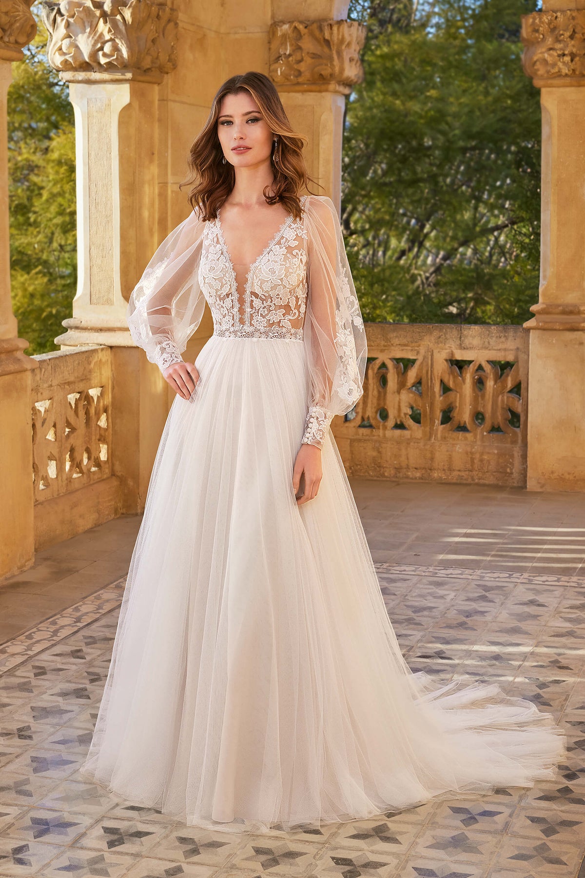 Denne eventyrlige A-line brudekjole er skabt i let English net, der giver et romantisk og luftigt udtryk. Den dybe V-hals tilfører en sofistikeret elegance, mens de luftige bishop-ærmer skaber et klassisk og feminint look.