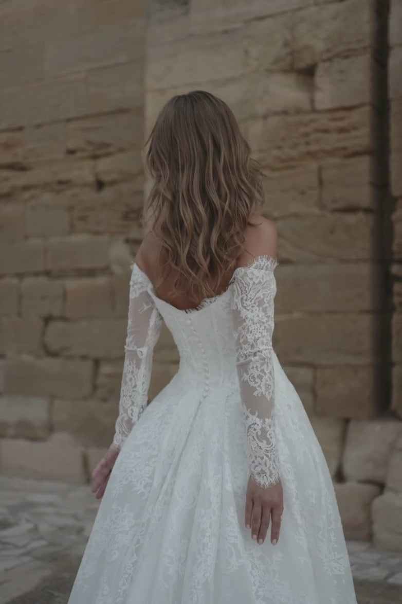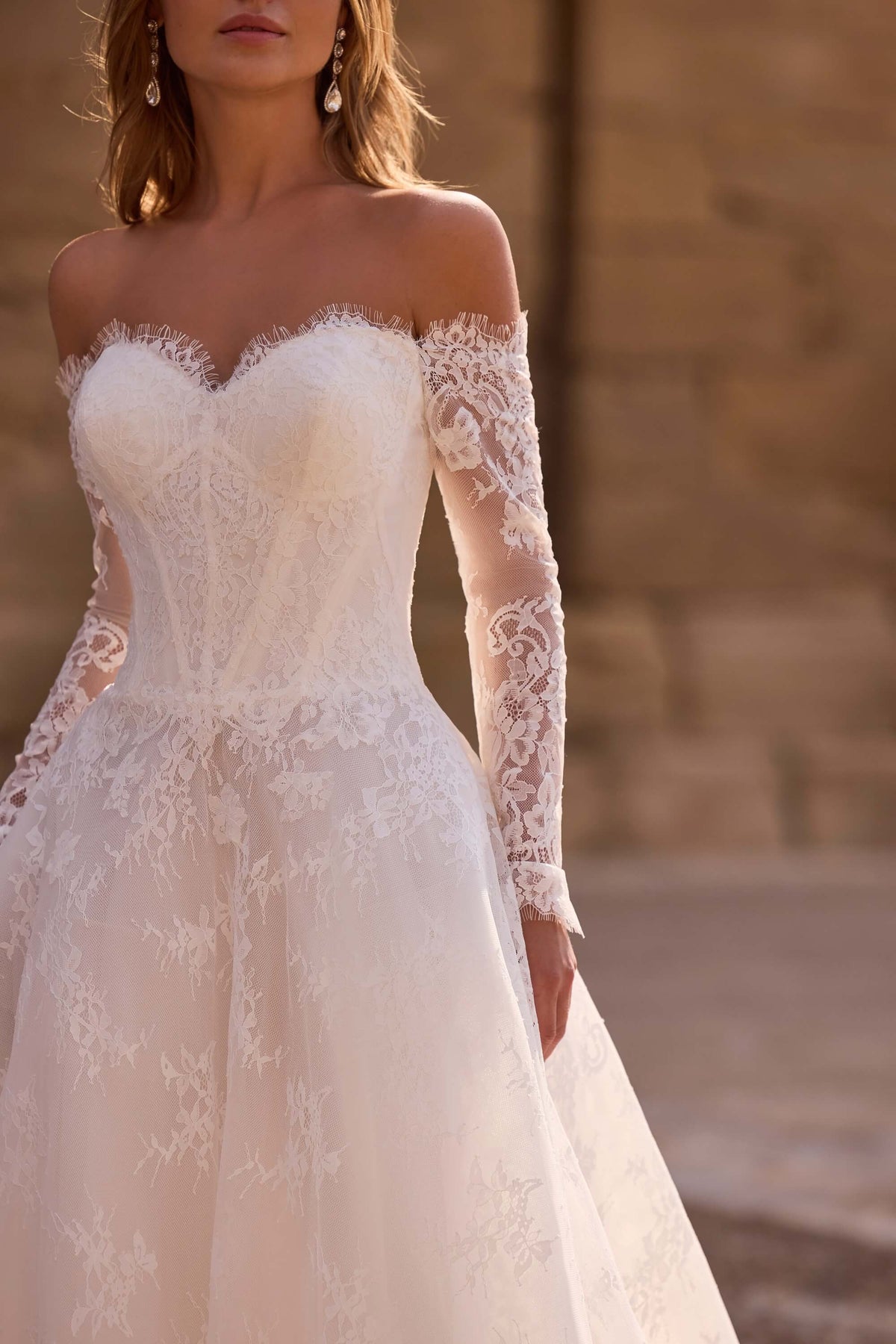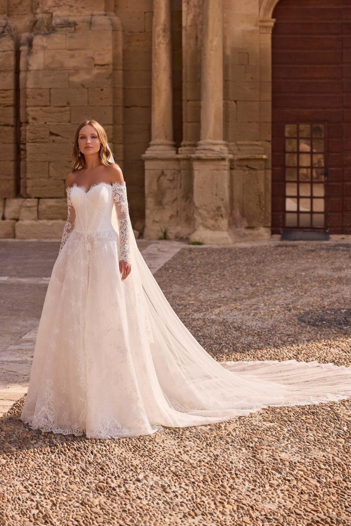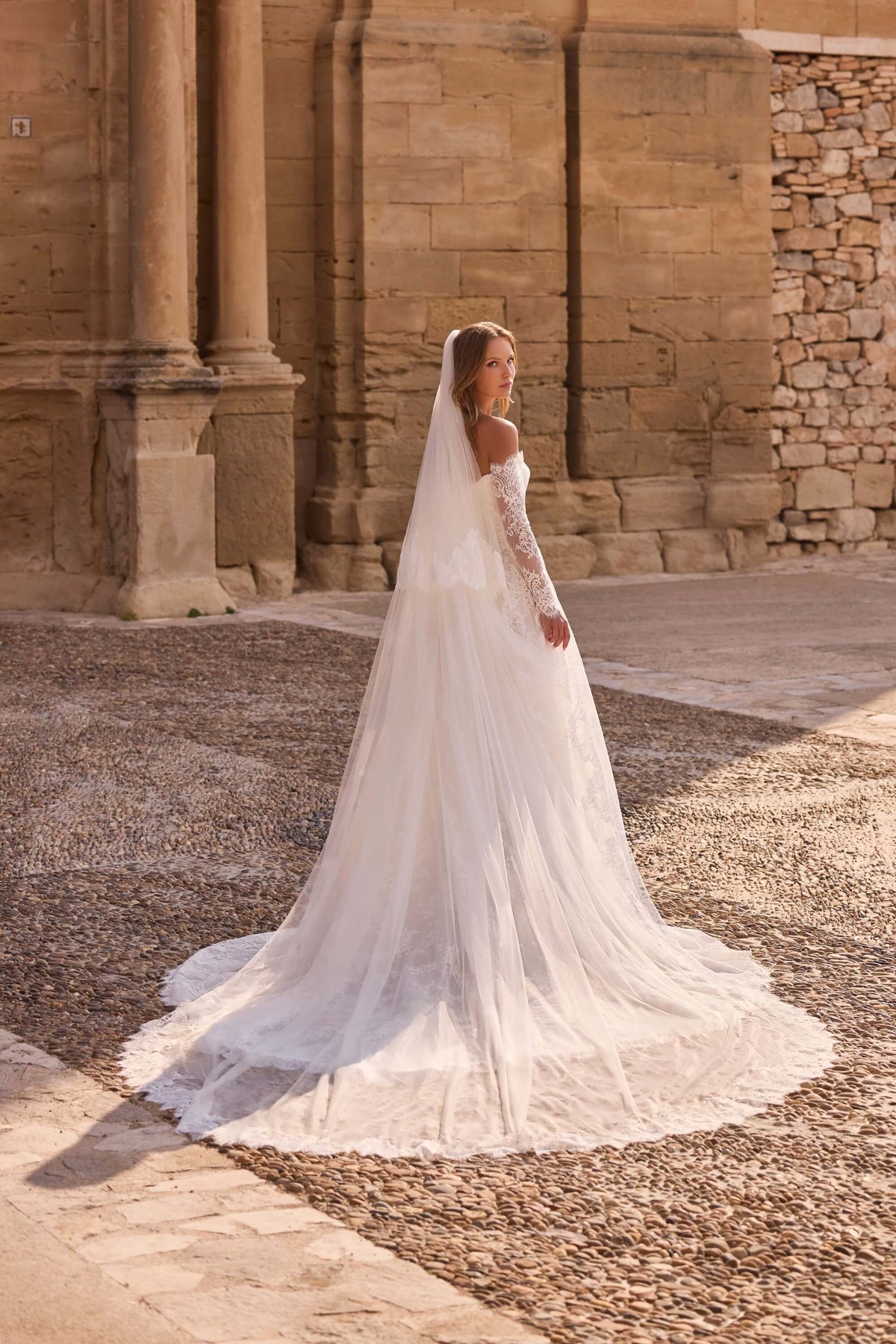 De lange blondesærmer skaber et feminint og sofistikeret udtryk, og den tilhørende lange tylslæb fuldender det drømmende helhedsindtryk. Et perfekt valg til bruden, der drømmer om et eventyrligt look med klassisk silhuet og luksuriøse materialer.