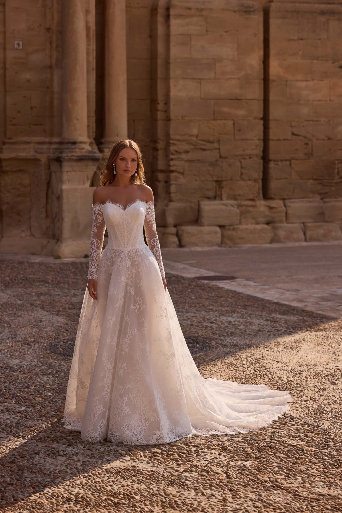 Romantisk A-line brudekjole i blonde med lange ærmer og katedralslæb