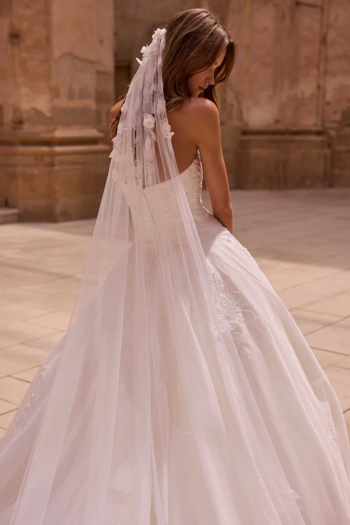 Skørtet er udført i let organza med delikate blomsterbroderier, der fortsætter hele vejen ned til det romantiske katedralslæb. En eksklusiv og detaljeret kantbrodering giver kjolen et ekstra touch af håndværk og finesse. Kjolen styles med et matchende slør med 3D blomster og kan suppleres med lange blondesærmer for et ekstra romantisk udtryk.
