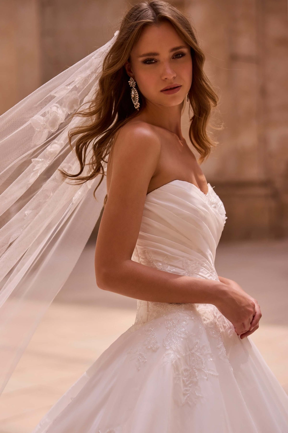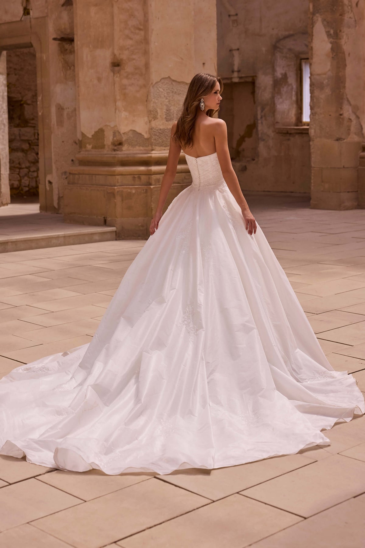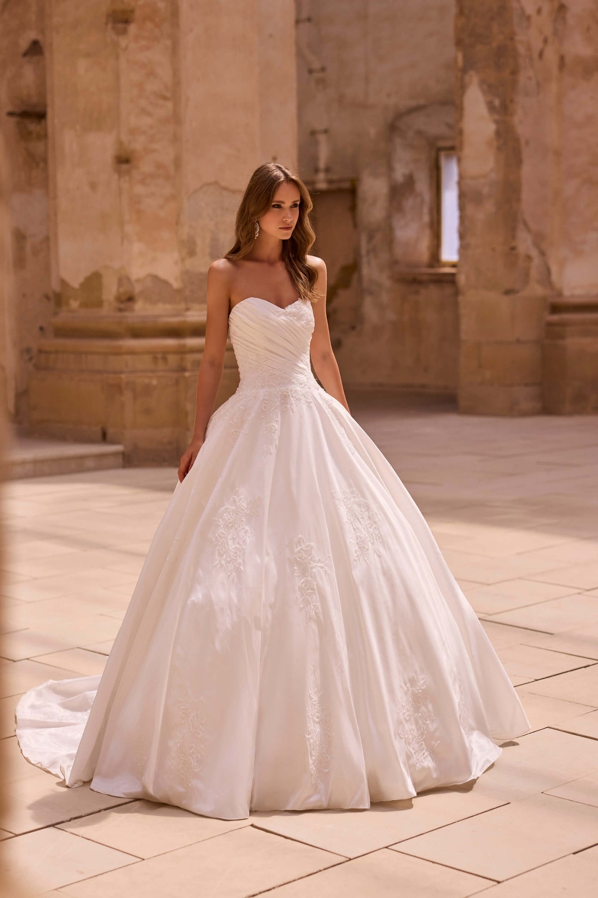 Denne drømmende Ball Gown fra Veni Infantino er skabt til bruden, der ønsker et eventyrligt og feminint look. Den stropløse corsage har en elegant sweetheart-udskæring og smigrende draperinger, der fremhæver taljen og overgangen til det voluminøse skørt.
